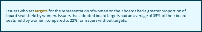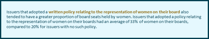 This report outlines key findings from a recent review of public disclosure required by Form 58-101F1 Corporate Governance Disclosure of National Instrument 58-101 Disclosure of Corporate Governance Practices (NI 58-101) regarding women on boards and in executive officer positions. This is the tenth consecutive annual review of this disclosure that we have conducted.[1] The review was completed primarily for the purposes of identifying key trends. A qualitative assessment of compliance with the disclosure requirements was not conducted.